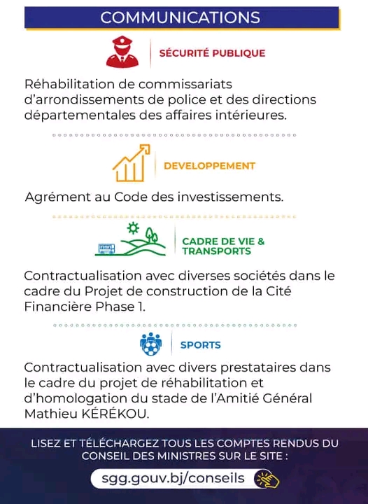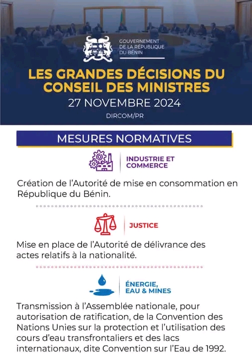 La rencontre hebdomadaire du Conseil des ministres s’est tenue ce mercredi 27 novembre 2024 sous la présidence effective du chef de l’État, le président Patrice Talon. Plusieurs décisions ont été prises lors de cette rencontre dont voici l’infographie numérique faite par la direction de la communication de la Présidence de la République.
