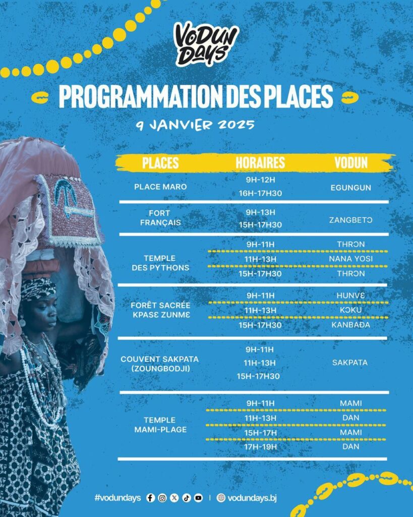 Pendant trois jours mémorables, notamment les 9, 10 et 11 janvier 2025, la cité historique de Ouidah abritera les manifestations aussi bien à la Porte du Non-Retour qu’au cœur de la ville de Ouidah sur plusieurs sites. Il faut retenir que pour le programme, des animations culturelles sont prévus les 9, 10 & 11 Janvier 2025 sur les places au cœur de la ville et sur la plage.